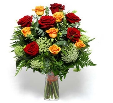 Sofisticato bouquet rotondo con rose dai colori raffinati del rosso e dell’ arancio con complemento di verde. |