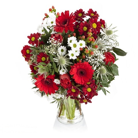 Bouquet con fiori misti color rosso e bianco, accompagnato da verde di complemento. |